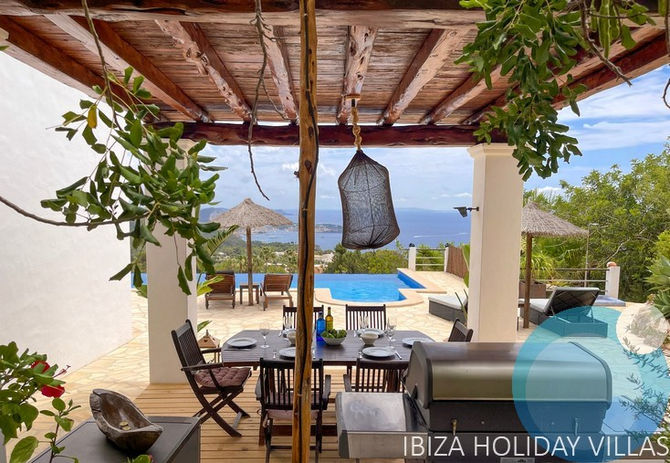 When the automatic entrance gate opens, you will be overwhelmed by a gorgeous sea view. This beautiful villa with infinity pool in the hills of Es Cubells, will make you feel right at home. Close to Cala D'Hort and Cala Vadella.