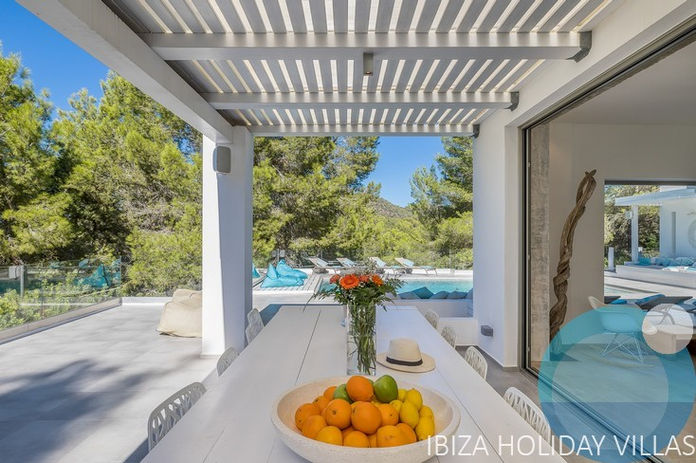 Dela is a beautiful luxury villa, which is just a few minutes drive from the beach of Cala Tarida. But of course all the southern beaches are within easy reach from the villa. We can guarantee you fantastic sunsets here from all terraces and the living room. New are an outdoor cinema and gym and there is a playground with trampoline, swings and a real tree house.