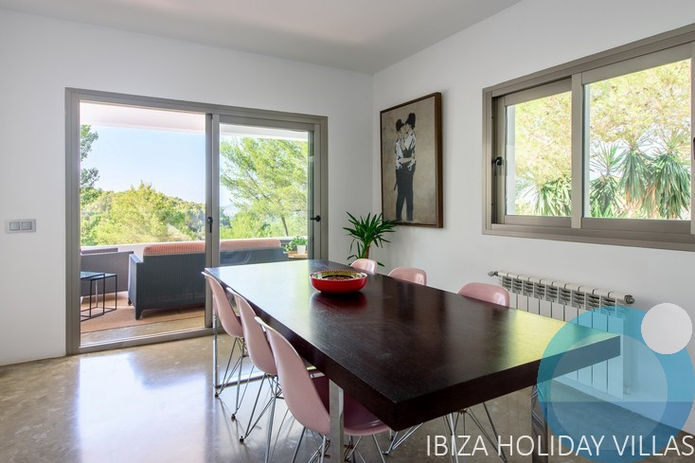 Modern sleek villa with different levels in the area of San Augustin. The villa has a heated swimming pool in the low season for an additional fee. The kitchen is really a dream for many a cook and everything is available. You can sit comfortably at the long dining table by the barbecue and in the evening you also have a great view over the beautifully lit bay of San Antonio.
